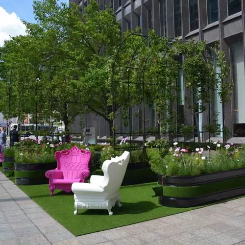 Maintenance is easy for the outdoor turf, as you can just rinse it with water. Rainwater will often take care of the cleaning process for you automatically with an outdoor installation. To fluff up matted fibers, you can use a broom or rake.