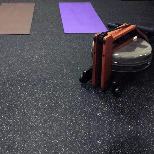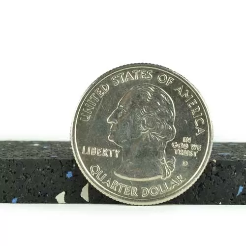 Each roll of this colored rubber floor consists of a primarily black color, but color flecks are introduced into the gym flooring. You can select from 10% color flecks of blue or 10% color flecks of light gray in these gym flooring rolls.