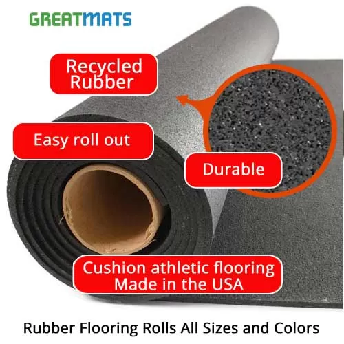 These gym rubber flooring rolls are a Made in the USA product that has a Shore A 62 material hardness rating, which ensures they will stand up to tough conditions nicely. Should any portion of the surface of the rolled rubber flooring become damaged, this is a reversible product.