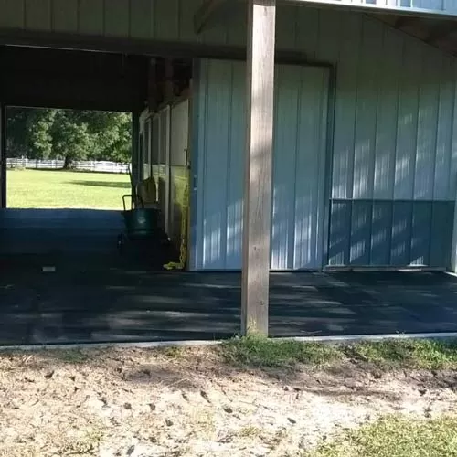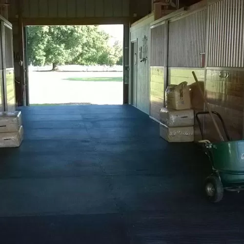 In the horse barn, the rubber flooring provides slip protection for both the handlers and the horses. Additionally, it gives the horse a safer place to stand and rest versus bare dirt or gravel, which can develop ruts and become uneven. Rubber has just a little bit of cushioning to protect the leg and hip joints of the animal.